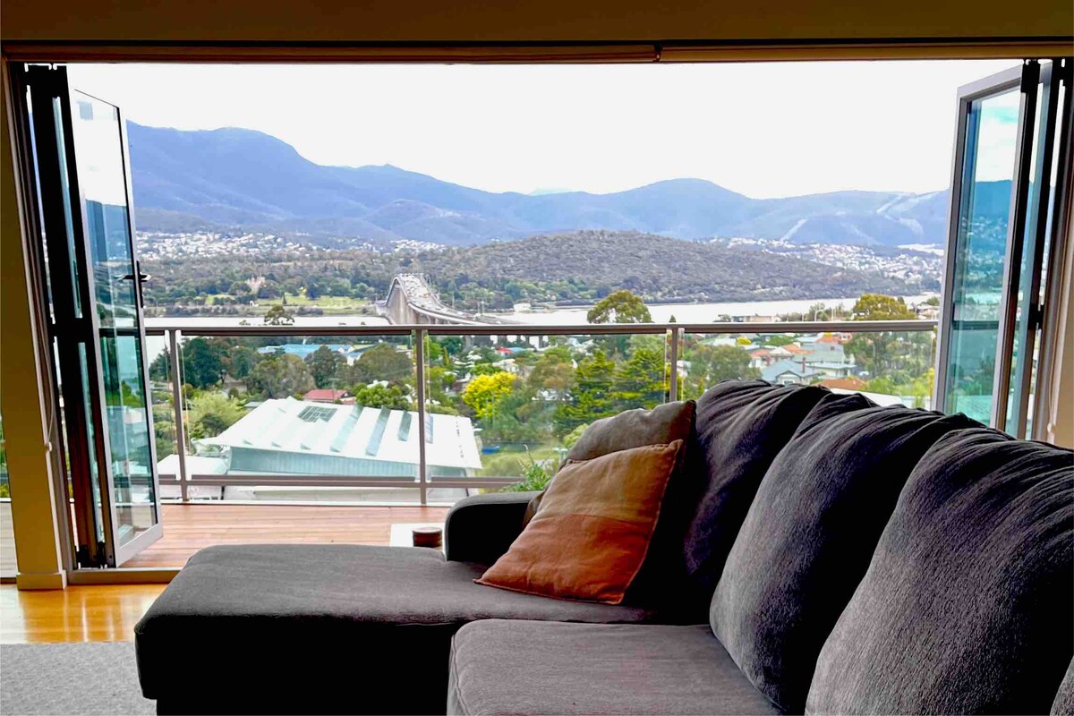 We want to offer visitors to Hobart a unique & luxurious accommodation experience, which connects modern design with its rugged, bush environment. Located in West Hobart, we are a short 8 minute drive to the Salamanca water front. Our 2 story house is nestled in a private bushy street, with amazing views of the Derwent River, South Hobart, Sandy Bay & beyond. The home is spacious and private, yet surrounded by (harmless) local wildlife. You will see many wallabies grazing on the property.
