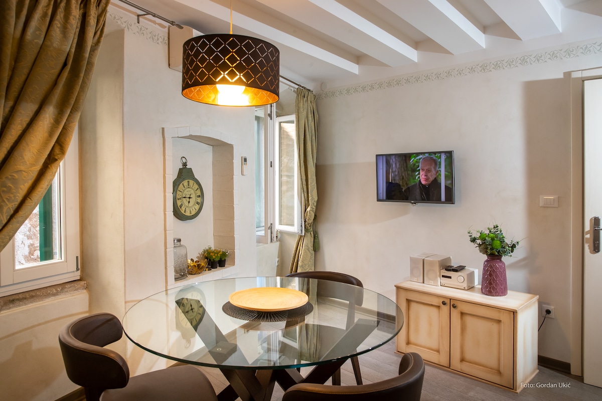 Directly on the seafront Originally built in 1670 under Venetian rule, the seafront palazzo was recently meticulously restored. It comes with 3 bedrooms with en-suite bathrooms, a large living room, an open plan kitchen-dining area with fireplace, and its own seafront terrace with private sea access! It is right in the historic part of Rovinj, but quietly tucked away from the bustling restaurants and bars. Restored to highest standards and interior designed