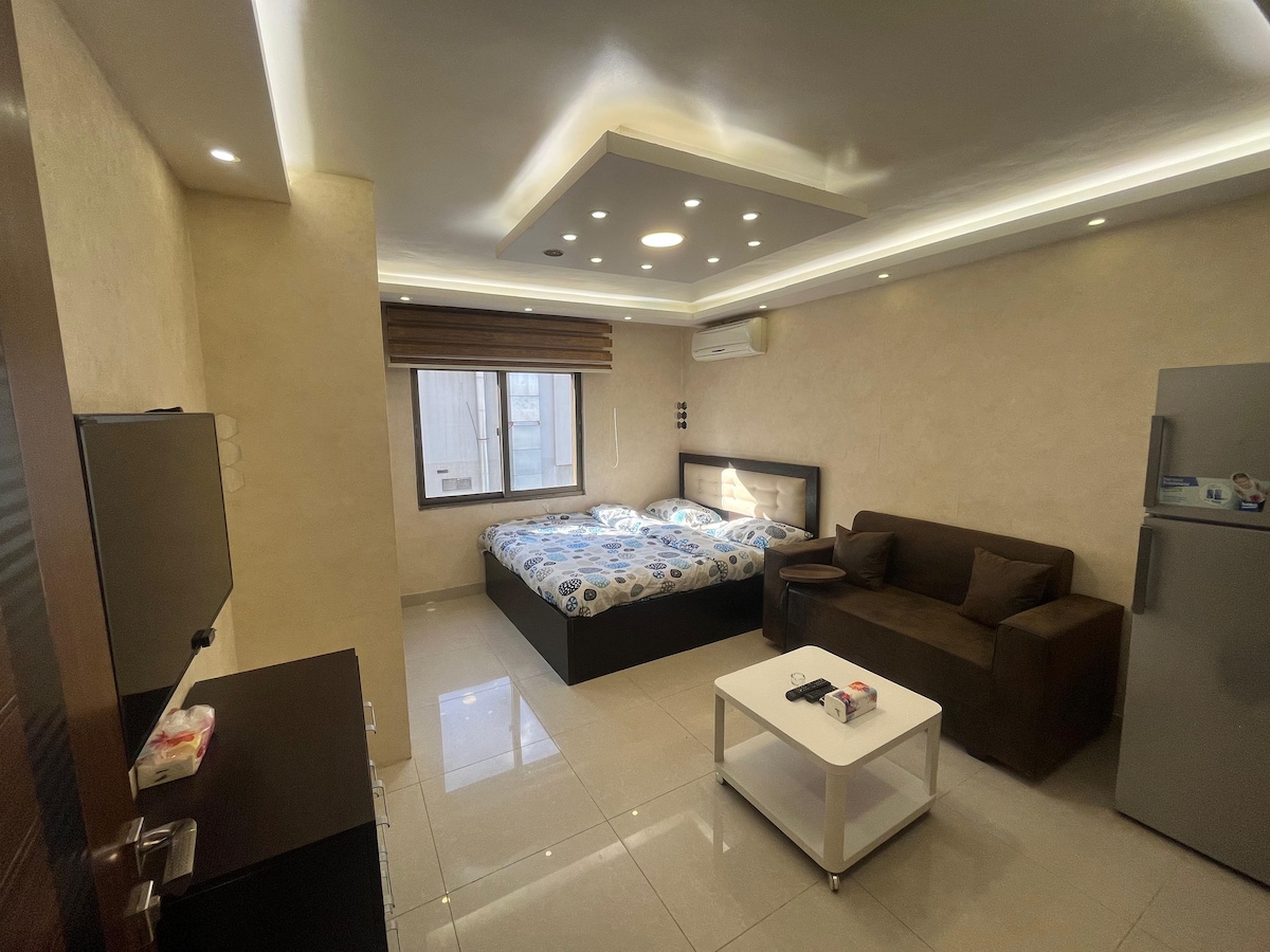 Welcome to this cozy and modern studio, perfect for a comfortable stay in Amman. Located conveniently near malls, restaurants and cafes, you'll have easy access to the best shopping and services. Equipped with everything you need to feel at home. The studio features a kitchenette with all essentials, air conditioning & TV for your entertainment. The bathroom is sleek and modern, with a shower. Step outside onto the spacious terrace that offers a stunning view of Amman’s skyline with BBQ space.