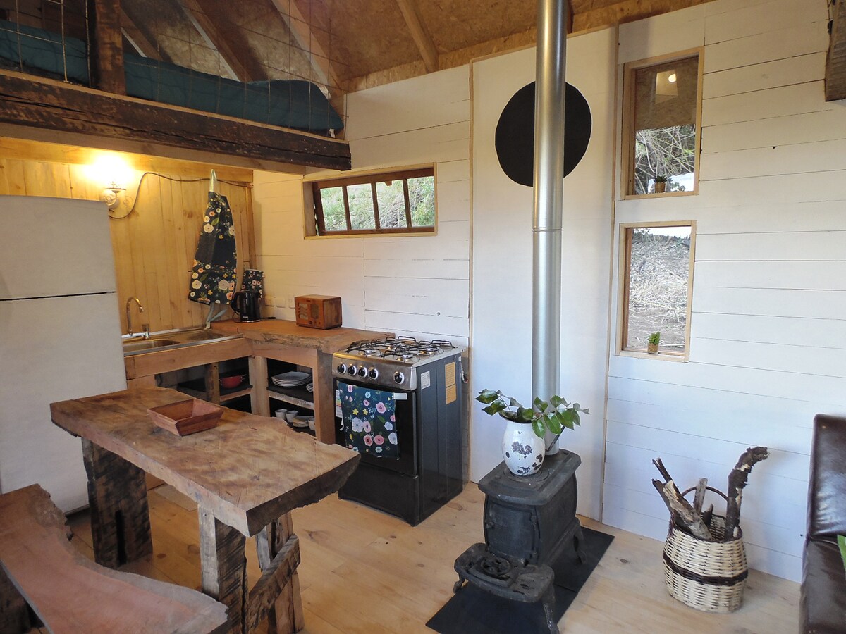 "El Descanso Refuge" is ideal for disconnecting and relaxing, away from the noise and routine of the city. It has beautiful views, surrounded by meadows and trees. It is a rustic and cozy tiny house of 32 square meters, ideal for families or couples who want to live a different experience and share unique moments, remembering childhood in the tree house. It is very private. It is located on a 5,000 square meter lot. I live on the same lot so we will be attentive to everything you need.