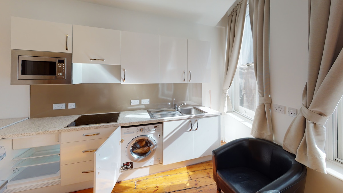 A modern studio in the heart of Nottingham City at the back of the building so more quiet. Only 100 m from the Victoria Centre and Market square. Double bed and ensuite, it is also equipped with a high specification kitchen including AEG hob, washer / dryer, fridge and grill microwave. It has fast wifi internet, a small sofa, 4k smart Samsung 40" TV swivel mounted, bar table with leather bar stools. Flexible self check in from the key safe at the main entrance.