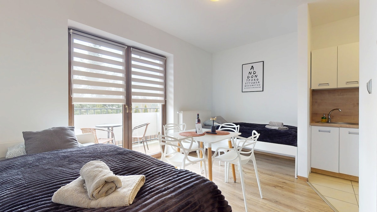Modern apartment in a quiet, green area, just a few minutes from the highway. Perfect for business travelers and tourists. Guests have access to: a spacious living room with kitchen and dining room (also as a place to sleep), a bedroom with a double bed, a single room, a bathroom with a bathtub and shower, a large balcony. Apartment on the 1st floor, with a separate entrance and a parking space for 2 cars.
