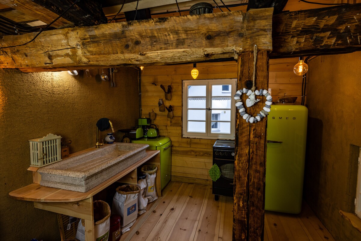 Our Heidi House is located in the middle of the Black Forest, in a small valley surrounded by green meadows. Next to the Heidi house is the farm we live on. The Heidi house is detached and has a separate entrance, so your privacy is guaranteed. The farm is located at the end of a road, with no traffic passing through, and is surrounded by meadows, fruit trees and forest. Our own stream and a small pond with a bench on the property invite you to relax.