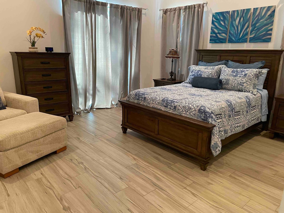 Great for a couple with 1 -2 young kids or a getaway for 2 or a business traveler. Guesthouse is totally separate from the main house. Bedroom-king sized bed. Couch, 24 inch high twin air mattress and ottoman w/ twin sized bed. Fully screened lanai/Indoor HEATED private pool/w 8ft wall (swim at your own risk). No pets. WiFi/cable TV. 10 minute drive to the beach/shopping. Walking/biking/jogging path. 4 bikes-(ride at your own risk)/BBQ grill/continental breakfast/a variety of snacks/beverages