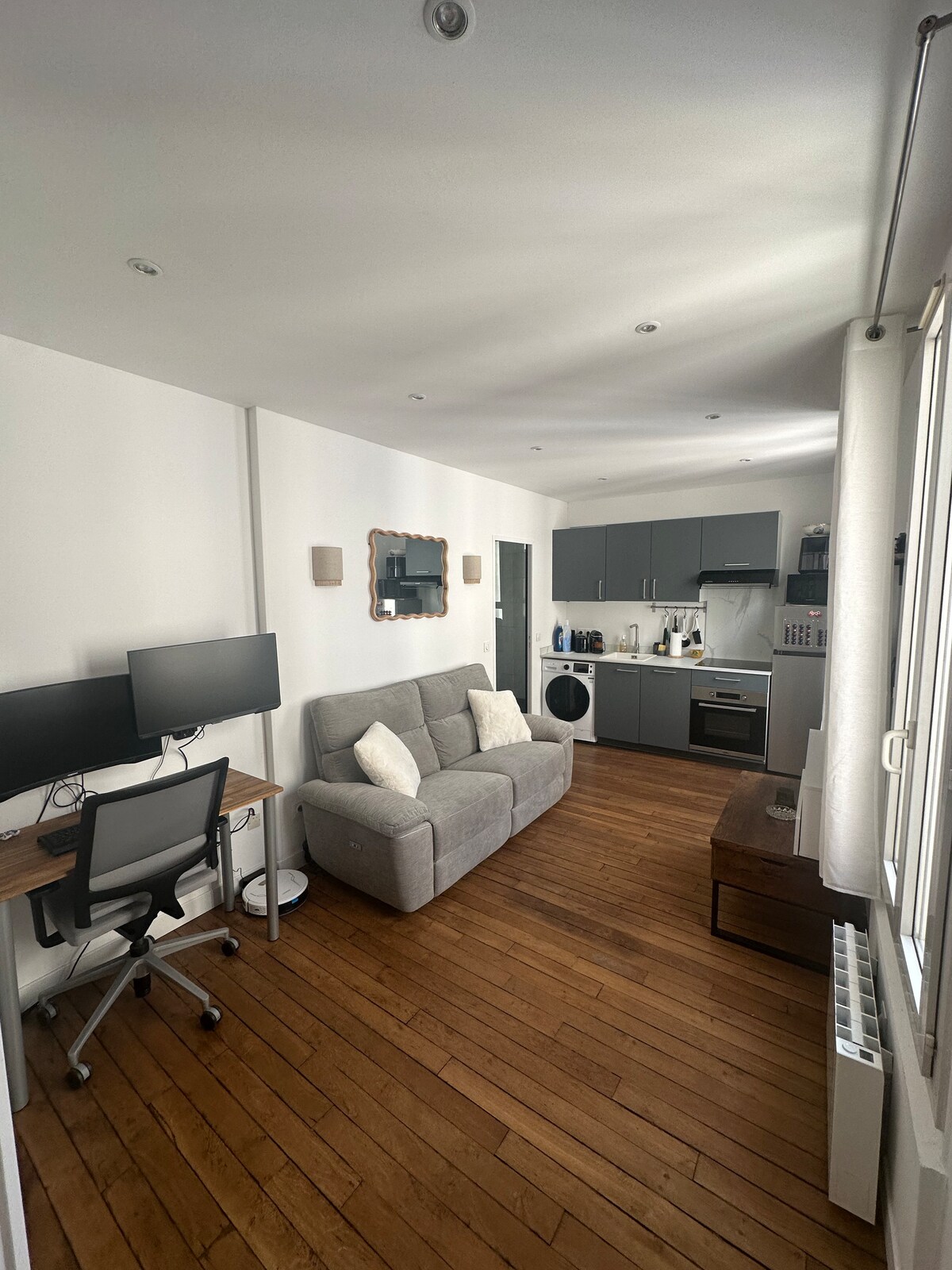 Perfect for a romantic stay, a business trip or a getaway with friends. ✨ Highlights: Bright and cozy space overlooking courtyard for absolute calm. Fully equipped kitchen, elegant bedroom: 160 cm bed with built-in storage, neat decor. Fiber connection to work comfortably 📍 The best of the best in location: 2-minute walk to the L line to quickly reach Paris. Shops, restaurants and cafés in the immediate vicinity, So Ouest. Quiet and secure neighborhood.