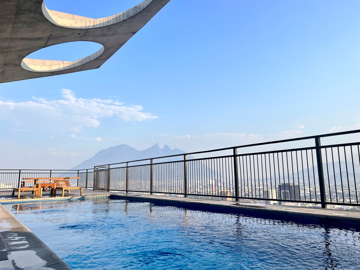✨ Experience Monterrey from Above 🌆 Relax in our modern 2BR/2BA apartment in San Pedro with stunning panoramic views. Two queen beds, 2 full bathrooms, fully equipped kitchen, A/C, fast WiFi, washer-dryer, parking & 24/7 security. Perfect for business, medical or leisure trips: minutes from top hospitals, Showcenter, shopping centers and the best restaurants. Ideal for short or long stays, blending the comfort of home with the boutique experience only San Pedro can offer.
