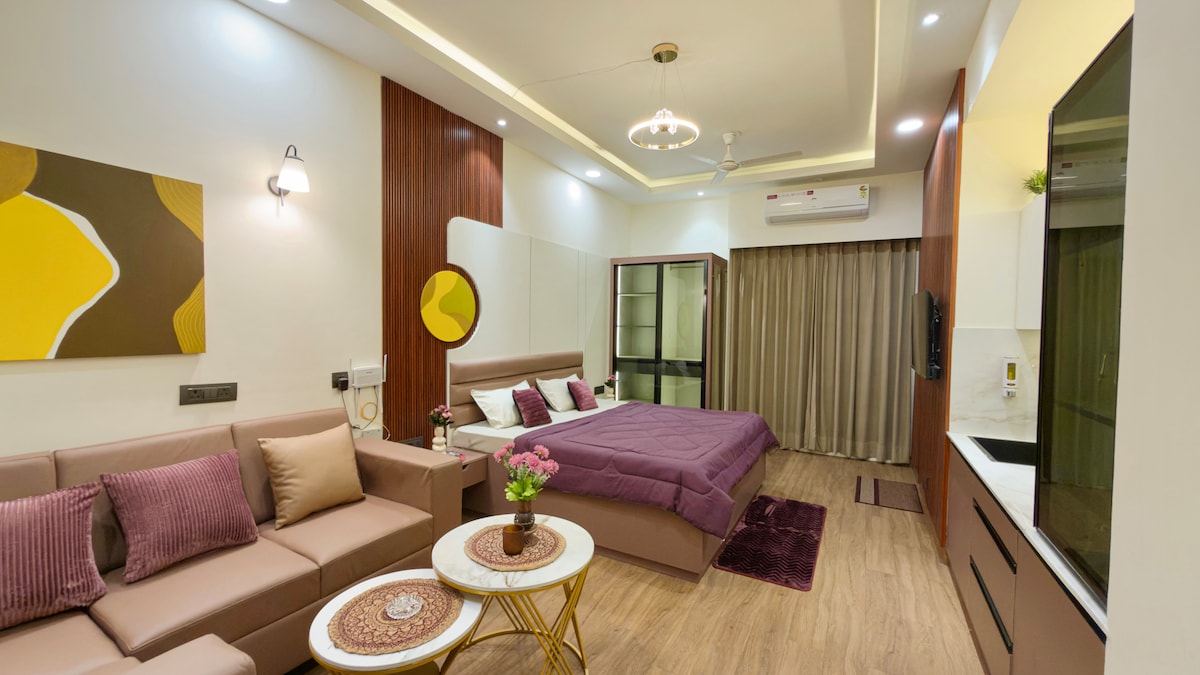 Experience a serene stay that blends modern and contemporary European aesthetics. With clean surroundings, curated details, and muted wall tones, the space offers a calm and sophisticated atmosphere ideal for couples or working professionals. Includes Free Parking. Close to Expo Ground The studio is equipped with essentials for a comfortable short stay, including a cozy bed, functional kitchenette, high-speed Wi-Fi. Perfect for those seeking a quiet retreat with effortless charm and convenience