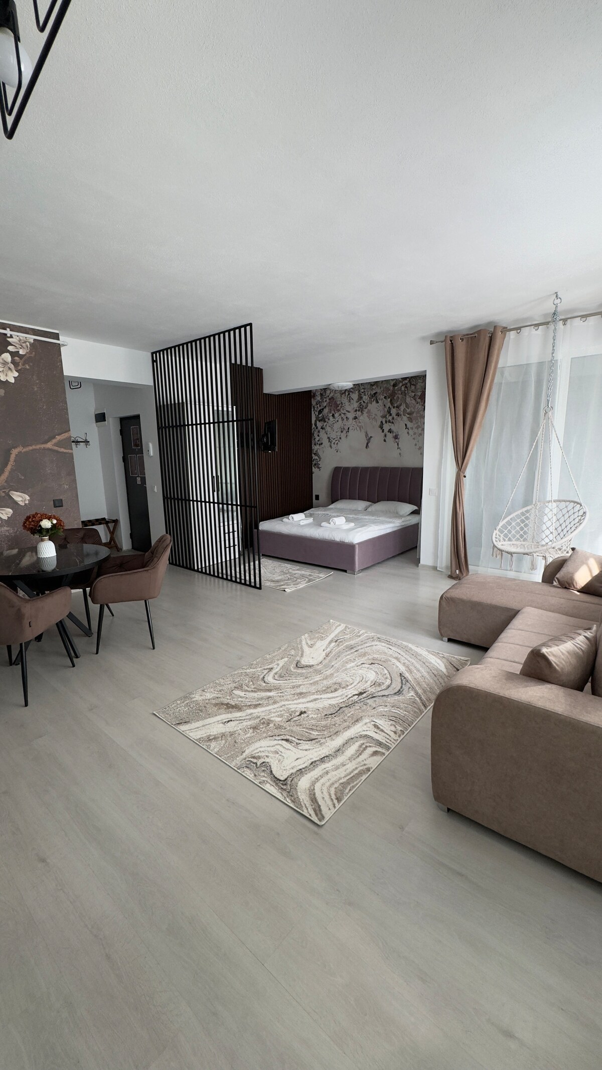 Apartament modern, elegant și primitor, ideal pentru sejururi scurte sau business. Dispune de două aere condiționate, balcon, parcare privată și un spațiu dedicat pentru lucru. Mobilat cu designer, oferă confort premium: pat king-size, bucătărie complet utilată, veselă, dotări moderne și un ambient rafinat, locul perfect pentru relaxare și productivitate.