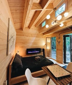 Our Nordic forest chalet is perfect for spending quality time as a couple (or with a kid), or for a work-retreat (with high-speed WiFi). The wooden interior is warm and cozy. The full-height windows offer stunning views over a forested valley. The open-concept kitchen and living room keep you in the conversation while cooking. If you prefer to cook outside, there is a fire pit with a grill and outdoor dining table. Only 70-min drive from Montreal. The lake is a 25-min walk if you park nearby.