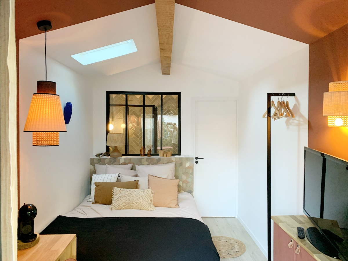 Passionate about the 90s, we created this nostalgic little cocoon to relive this cult era. Since we don't always have time to enjoy it, we make it available to share this unique atmosphere. This cozy studio of 15 m², combines comfort and retro style: high-end sofa bed, equipped kitchen, separate bathroom, reversible air conditioning. Wifi, Netflix, Amazon, Disney+ included. Welcome coffee offered for a practical and warm stay, perfect for a comfortable stopover