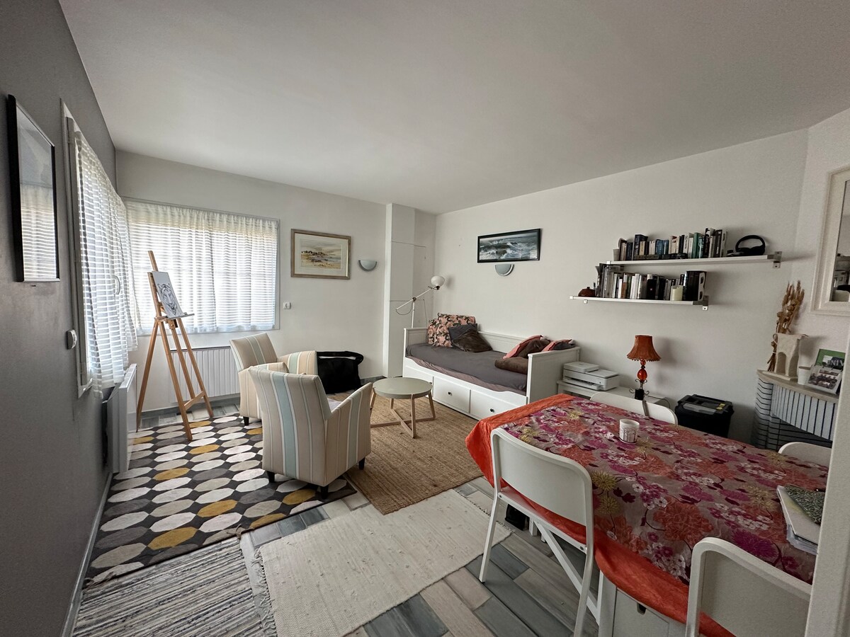 It's a peaceful oasis Between Courseulles and Ouistreham, my small 25 m2 refurbished apartment offers you real tranquility. Small feature: the bathroom is narrow and access to the bathtub can be difficult for people with mobility difficulties. Saint Aubin-sur-Mer is a family village where the living is good. The environment is very quiet and access to the sea is a stone's throw away (50 meters). And if you love history, you've come to the right place.