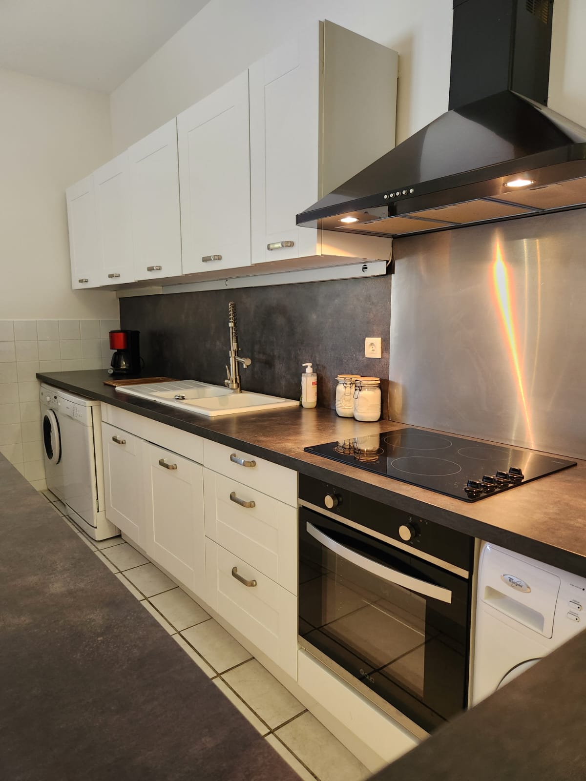 Bourgoin Jallieu near the city center, fully renovated 2-room apartment including living room, hallway with storage, fully equipped independent kitchen, 1 bedroom with closet and a bathroom with toilet. The property has a private terrace of 22 m2 with 1 parking space. Quiet space. Beautiful view. Close to amenities (train station, shops, cinema, highway access, etc.). Facilities: awning, barbecue, TV, desk, washing machine, dishwasher, fridge, coffee machine...