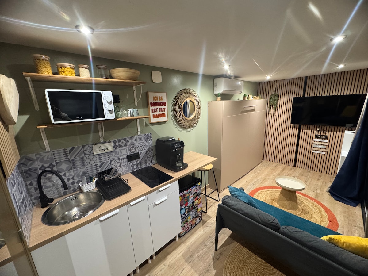 "We offer a charming atypical and fully equipped studio, at the gates of Toulouse. This accommodation includes a bathroom, a well-equipped kitchen and a cozy corner with a queen size bed. Located in a quiet area, it has private and secure parking. Just a 20-minute drive or bus ride (line 58) from Toulouse, it's the perfect place for business travelers, family visitors, or a romantic weekend."
