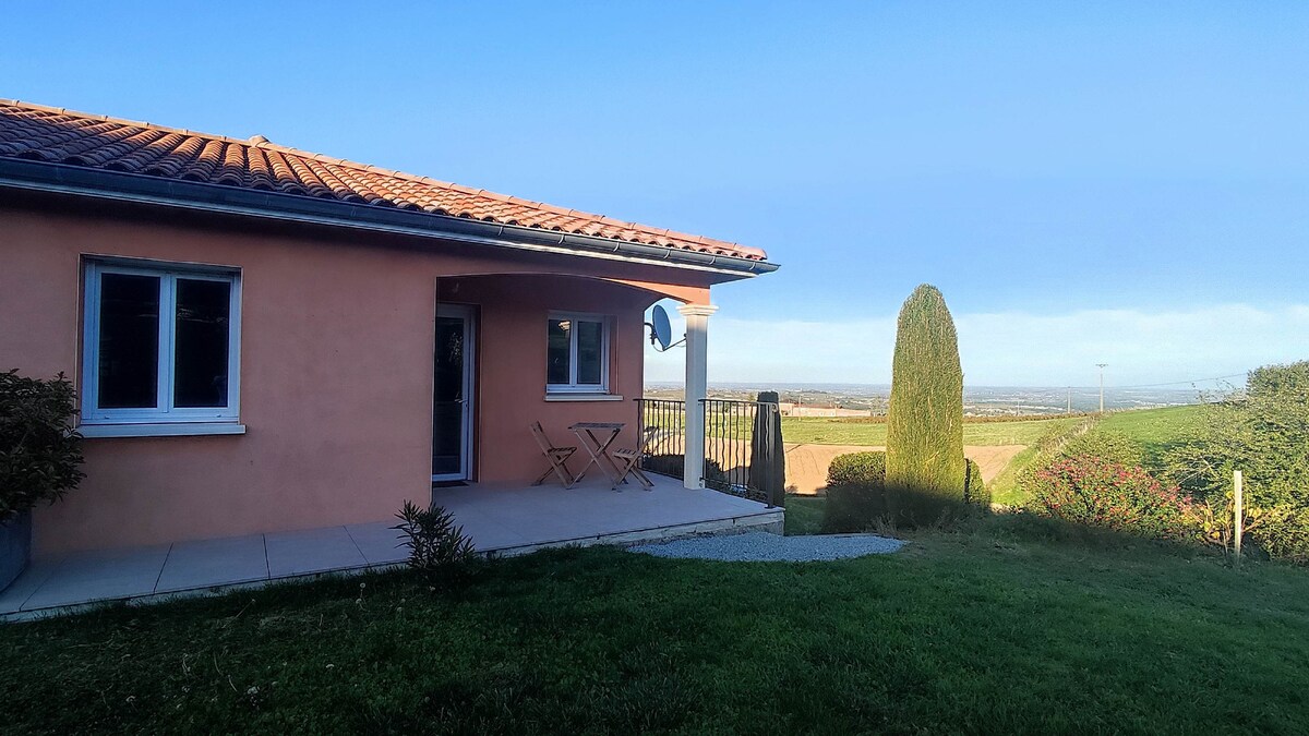 Small peaceful haven located in the heart of Beaujolais in an old winegrower's house. Enjoy a cocoon with views of the vineyards from your terrace, a wooded and flowery park of 5000 m². It is completely independent and next to the owners' house. We're 8 minutes from the A6. Great for a family break or a business stay. 10 minutes from Villefranche-sur-Saône (the most dynamic pedestrian city center in France) 30 minutes from Lyon.