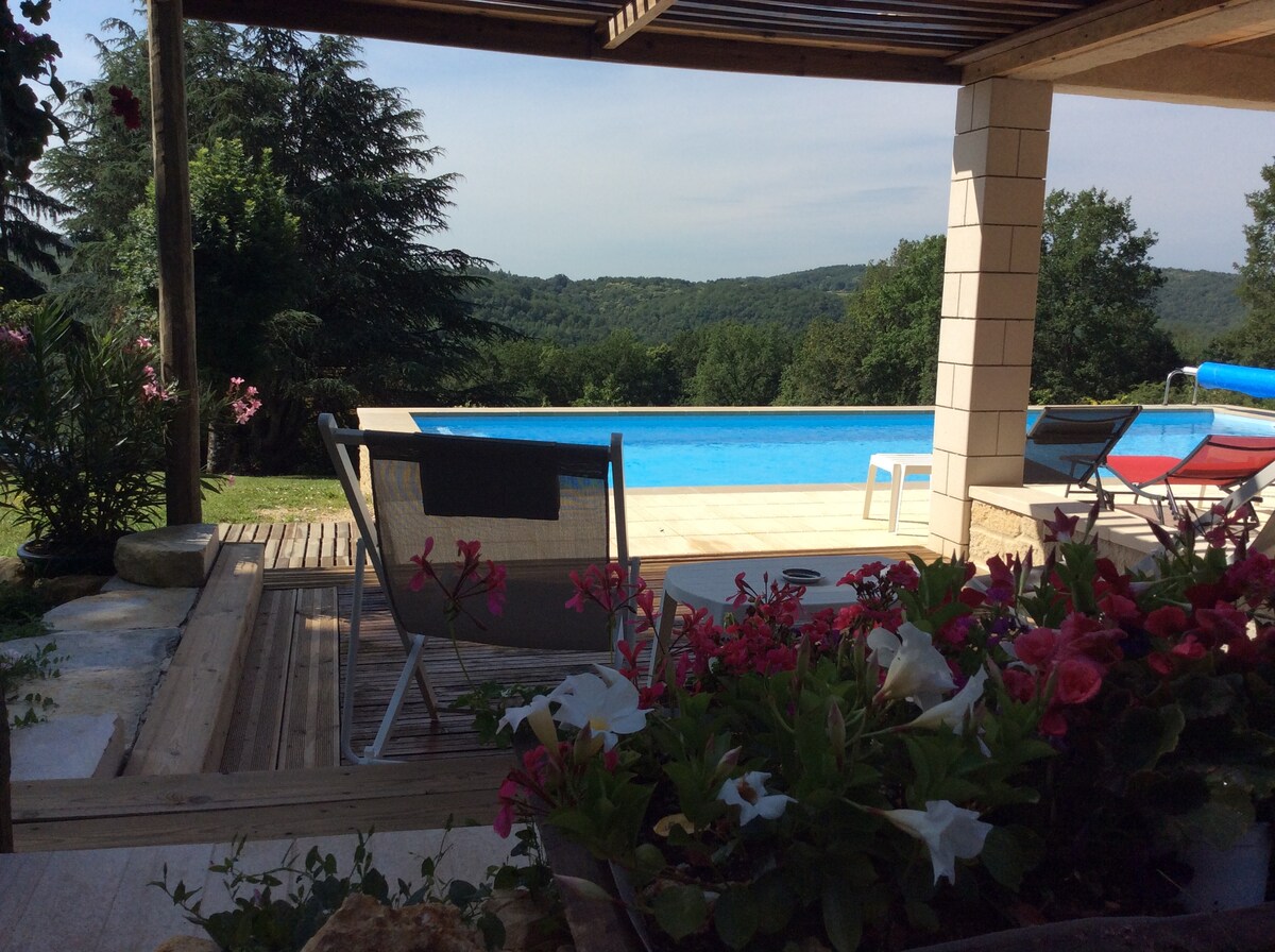 Relax in this charming 30 m2 studio, annex of our house with independent entrance, located in a very quiet area and offering you a magnificent view, 5 minutes from all shops and 10 minutes from the city center of Cahors. Beautiful living room with a bed, equipped kitchen and bathroom with toilet. You will have access to our swimming pool (we make sure to use the pool only in the absence of our guests) and can also enjoy a covered terrace and garden.