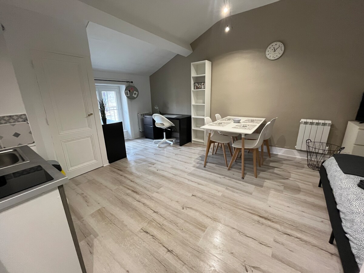 Welcome home to Saint-Étienne 🌸 A cozy apartment completely refurbished, ideally located in the center, right next to the Place Jean-Jaurès. Here, everything has been designed for your comfort: very high-speed internet, a bedroom with desk, a fully equipped kitchen, a bright living room and a quiet terrace overlooking an interior courtyard — a true haven of peace in the heart of the city. You will be in close proximity to restaurants, shops, trams and places of life in Saint-Étienne.