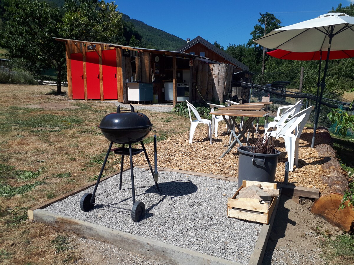Chalet of 20 m2, quiet, with a kitchen area, a bathroom, a living room equipped with a sofa bed, a TV and a mezzanine where there is a double bed. Terrace with outdoor furniture (table + chair + hanging chair) ➡️ Private Nordic bath available at extra cost The chalet is next to our main residence, so we are available to advise you during your stay while leaving you your privacy. 😊 Sheets and towels are provided.