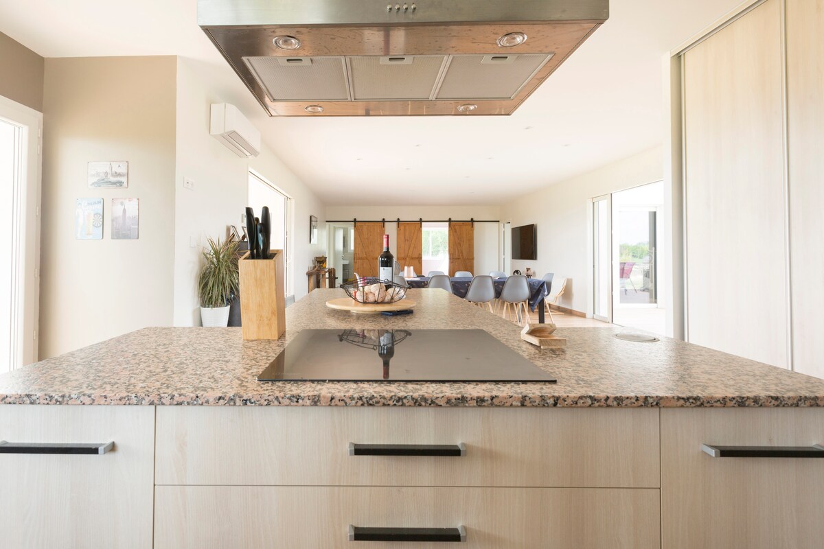 Country house close to shops (5 km) Weekly rental July August possibility of WE consisting of four bedrooms including a master suite with a 160 bed - possibility of 2 BB beds a very large living room 75 m2 American kitchen outdoor jacuzzi Lawn all around the house, with no close neighbors Equipped with washing machine, dishwasher and air conditioning. games room with foosball, billiards