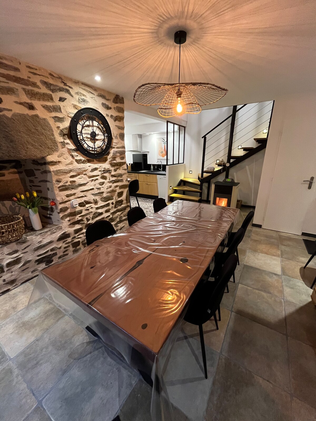 Large house (300 m2) in a green setting with no neighbors or overlooking. This pleasant house consists of a ground floor: entrance area with large wardrobe, equipped kitchen with fireplace + access to the terrace, large living/dining room with fireplace, 2 bedrooms with double beds, bathroom and a separate toilet. Upstairs, a small living room with a pellet stove gives access to a mezzanine with 2 single beds as well as 2 large bedrooms with double beds and shower room with toilet