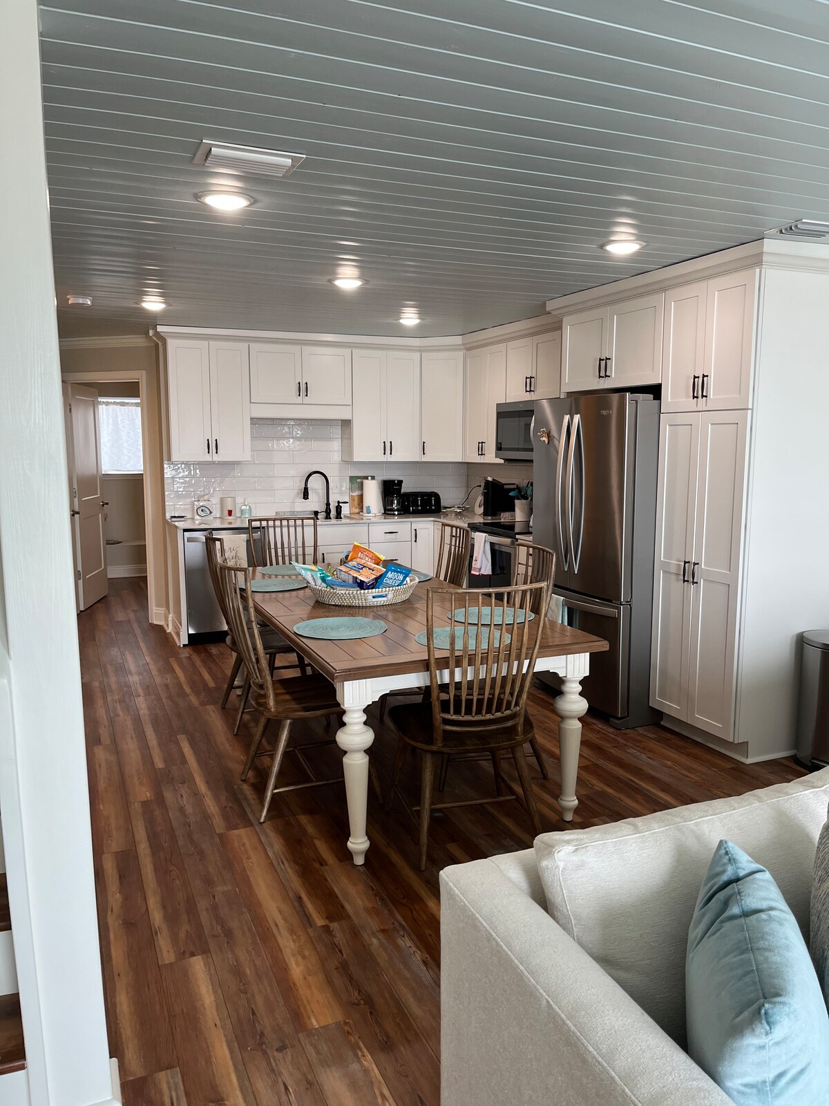 Large house with 3 bedrooms, 2 baths, large den, newly remodeled kitchen and dining room with table that seats 8. Outdoor area for grilling and relaxing includes patio furniture and a large screened in front porch. There is plenty of parking including a covered carport. Plenty of room for boat parking and hose for easy clean up after a day on the water. Fenced in pet area with access from screened porch and side yard.