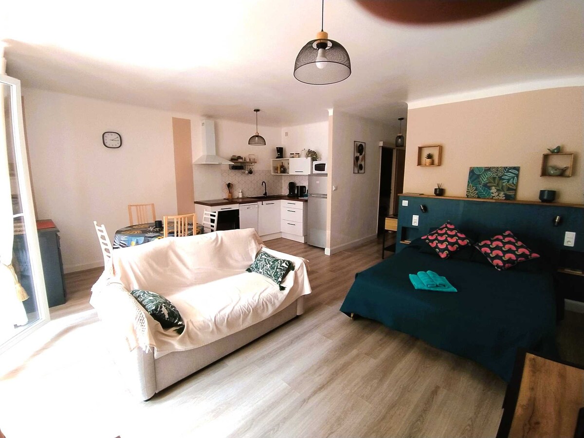 Nice apartment of 35m² completely renovated, with balcony and access to the garden, very quiet and bright. Located 3 minutes from the city center of Céret: museum of modern art, welcoming coffee terraces, Saturday morning market, visit of the old Céret... 30 minutes from the beaches (Argelès, Collioure...), 10 minutes from the Spanish border, at the foot of the mountains (peaks of 1000 to 2900m), 15 minutes from the thermal cities of Amélie Les Bains or Boulou. Cultural stay, laziness, health, or sports stay, it's up to you.