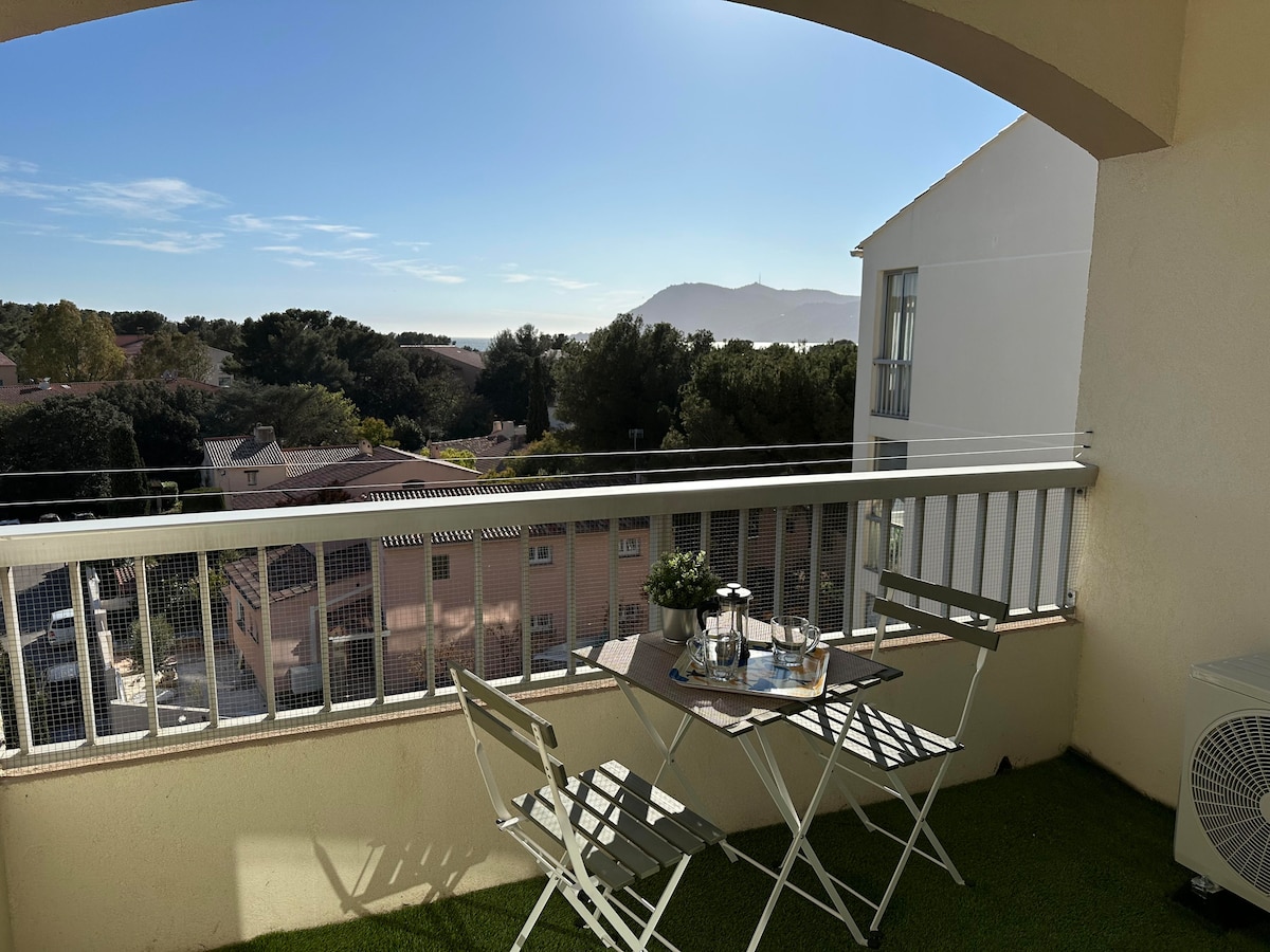 Relax in this quiet and stylish accommodation. In a new luxury residence, on the 1st floor with elevator, comfortable apartment, air-conditioned and quiet with a beautiful terrace overlooking the pine forest On the Saint Mandrier peninsula, Pin Rolland district, close to local shops and beaches within a 10-minute walk. Nearby, the tourist district of Les Sablettes offers restaurants, bars, markets and entertainment for young and old.