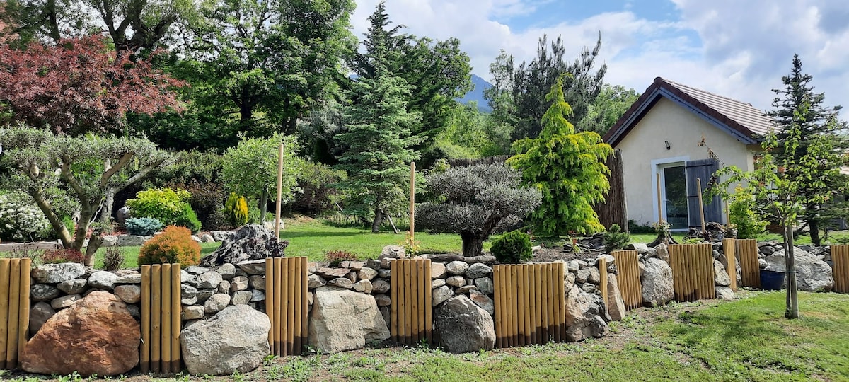 Ideally located in the Parc des Écrins, quiet and surrounded by nature. YAKA enjoy the spring water, the azure sky and your private jacuzzi available all year round (€40 for a 1.5-hour session for 2 to be booked on site). In a 6000 m2 park surrounded by mountains and close to hiking trails and four ski resorts in winter.
