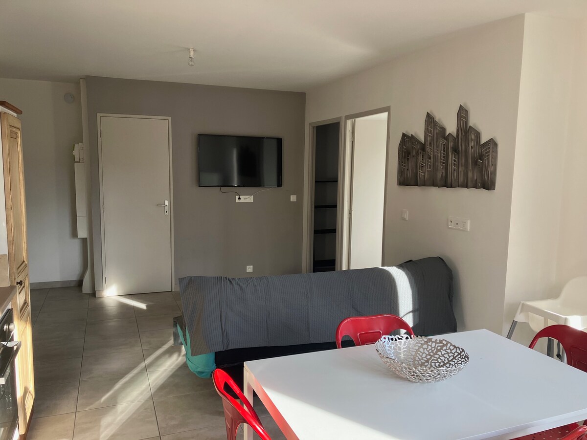 ✨ Night Cocoon – Cosy studio with green terrace 🌿 Brand new, independent and on one level. 🛋️ Living room with kitchenette & sofa bed, 🌞 bright bedroom, 🚿 modern bathroom. 🌿 Private terrace. 🍿 Wi-Fi, aircon, Smart TV Netflix + 50 channels (⚠️ no TF1 & M6). 🛏️ Linen, towels, soap, shampoo, hairdryer. 🍴 Kitchen: fridge, microwave, mini oven, washing machine, coffee maker, dishes. 🥐 Coffee, tea, drinks & madeleines offered. 🚶♂️ 10 min walk to city center & Sainte-Juste chapel.