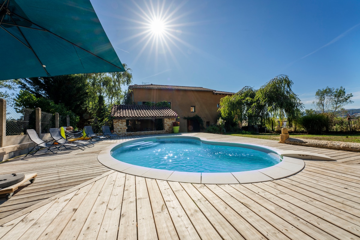 Quiet in a green environment, with stunning views, the location is ideal for discovering Beaujolais. Direct departure for walks, wine tastings, come and discover our beautiful villages in Pierres Dorées. We'll be happy to advise you. ⚠️it should be noted that to access the accommodation there is an outdoor metal staircase with steps in calbotis. Avoid if you have knee problems or if your pets don't go down the stairs.