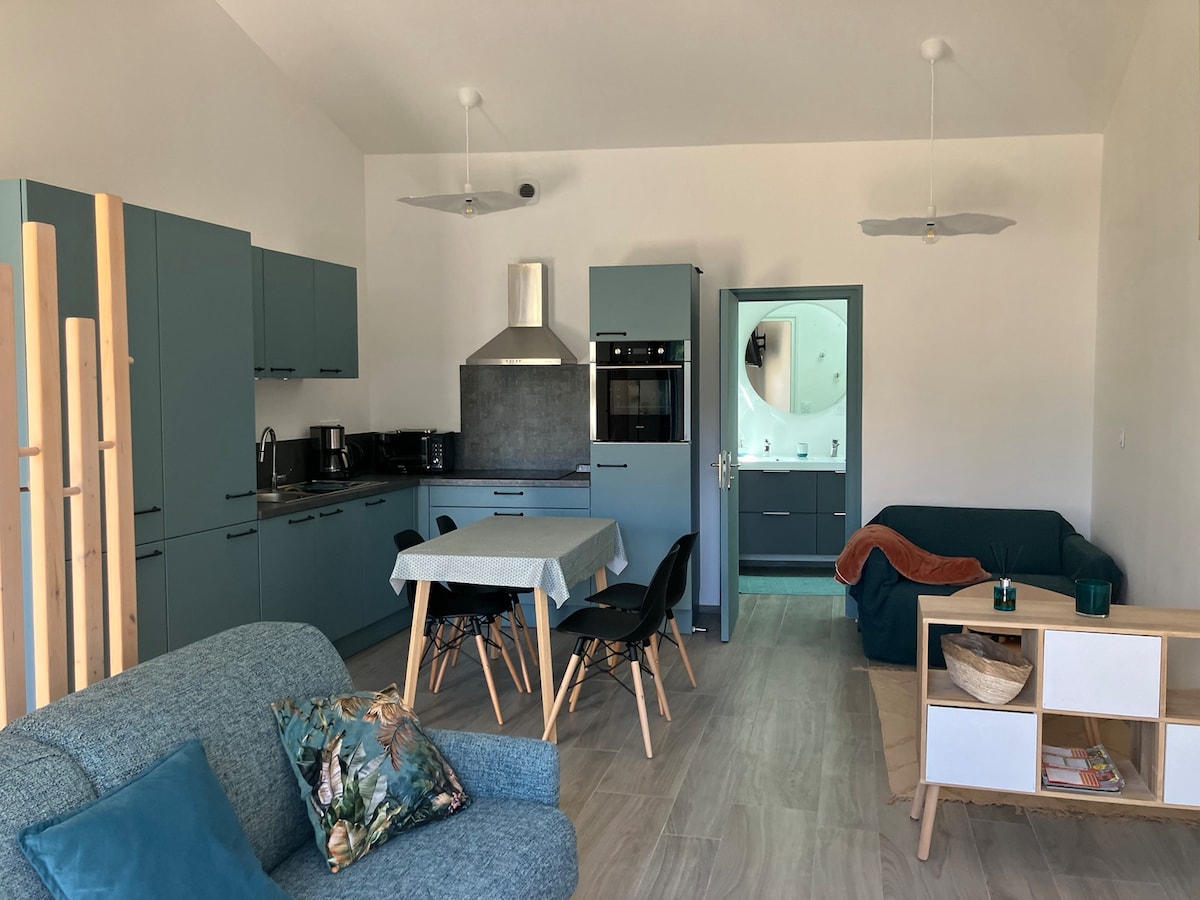 Kick back and relax in this calm, stylish space: ~ 2-room apartment, located in the heart of the small town of Dompierre-sur-Mer (a few minutes from La Rochelle/Île de Ré by car) and close to shops within walking distance (bakery, pharmacy, butcher, market...) ~ Composed of a large living room (living room/kitchen/dining room), a comfortable bedroom with open shower room, a separate toilet and a separate entrance ~ We remain available to help you prepare for your stay