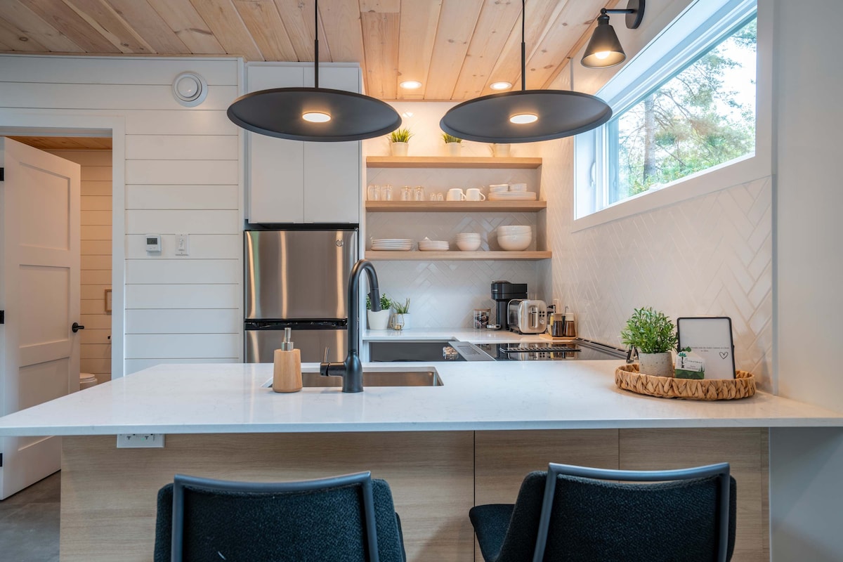 "Chalet Le Boisé" 1 hour from Montreal! Small chalet nestled in a wooded area, for 4-6 people. Experience the cocooning spirit with spa, clawfoot tub and indoor/outdoor fireplaces. Stunning views of the lake. High-speed wifi connection to combine work and relaxation. Perfect for families, couples and teleworkers looking for an escape. Your haven of peace awaits you! Note: Lake view, no lake access. Please respect the neighborhood 🙂