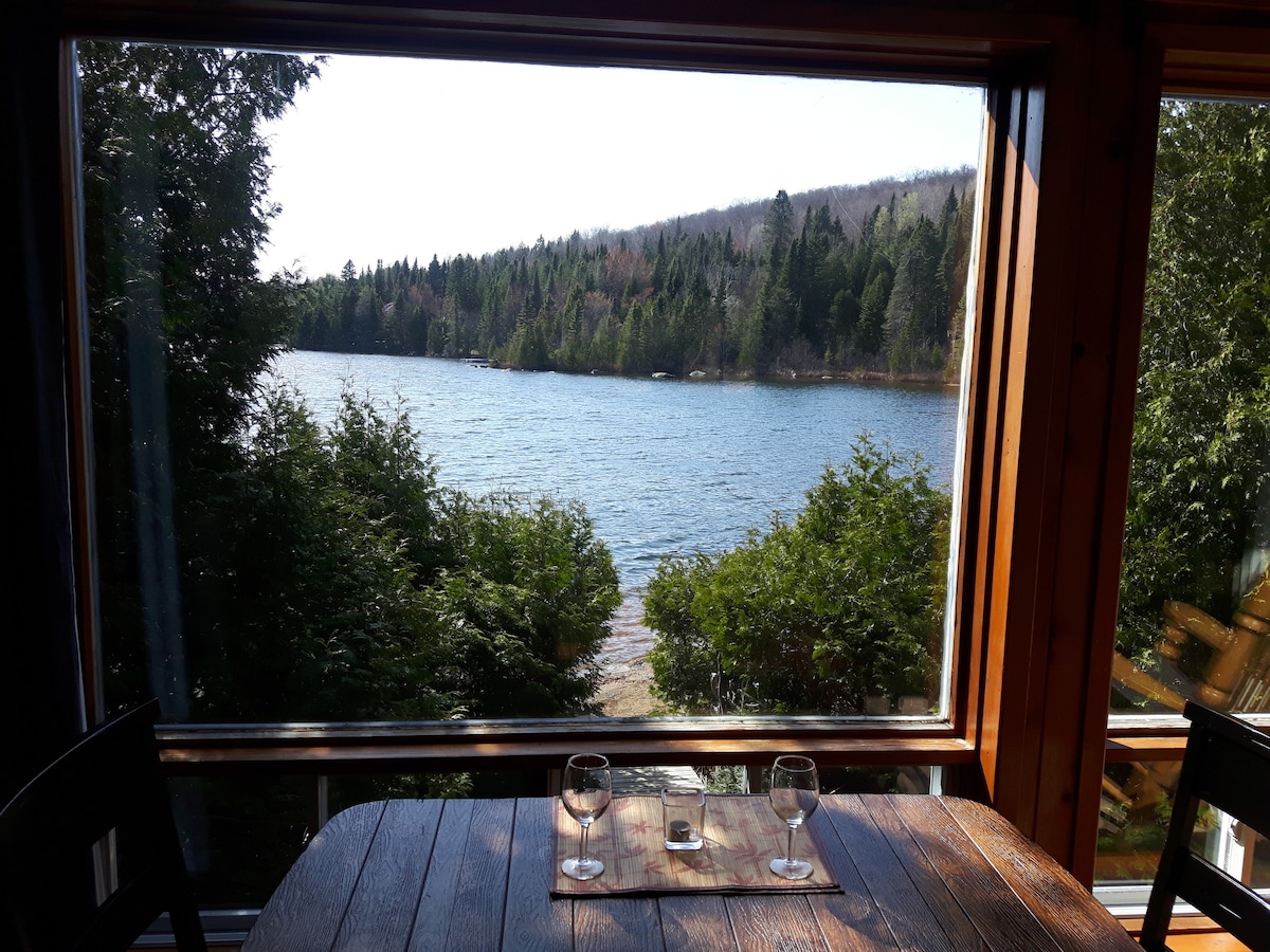 Charming little Swiss chalet overlooking a clear and natural lake (no motorboats). The rustic chalet is very warm and cozy. You can enjoy the wood and forest's scent and listen to the loons while sitting right above the magnificent pristine lake ! The huge private dock is just for you. Everything is there: fireplace, BBQ, satellite TV, unlimited WiFi, 2 kayaks, 2 canoes, trouts if you fish. 5 minutes from l'Estérel. CITQ number: 296337
