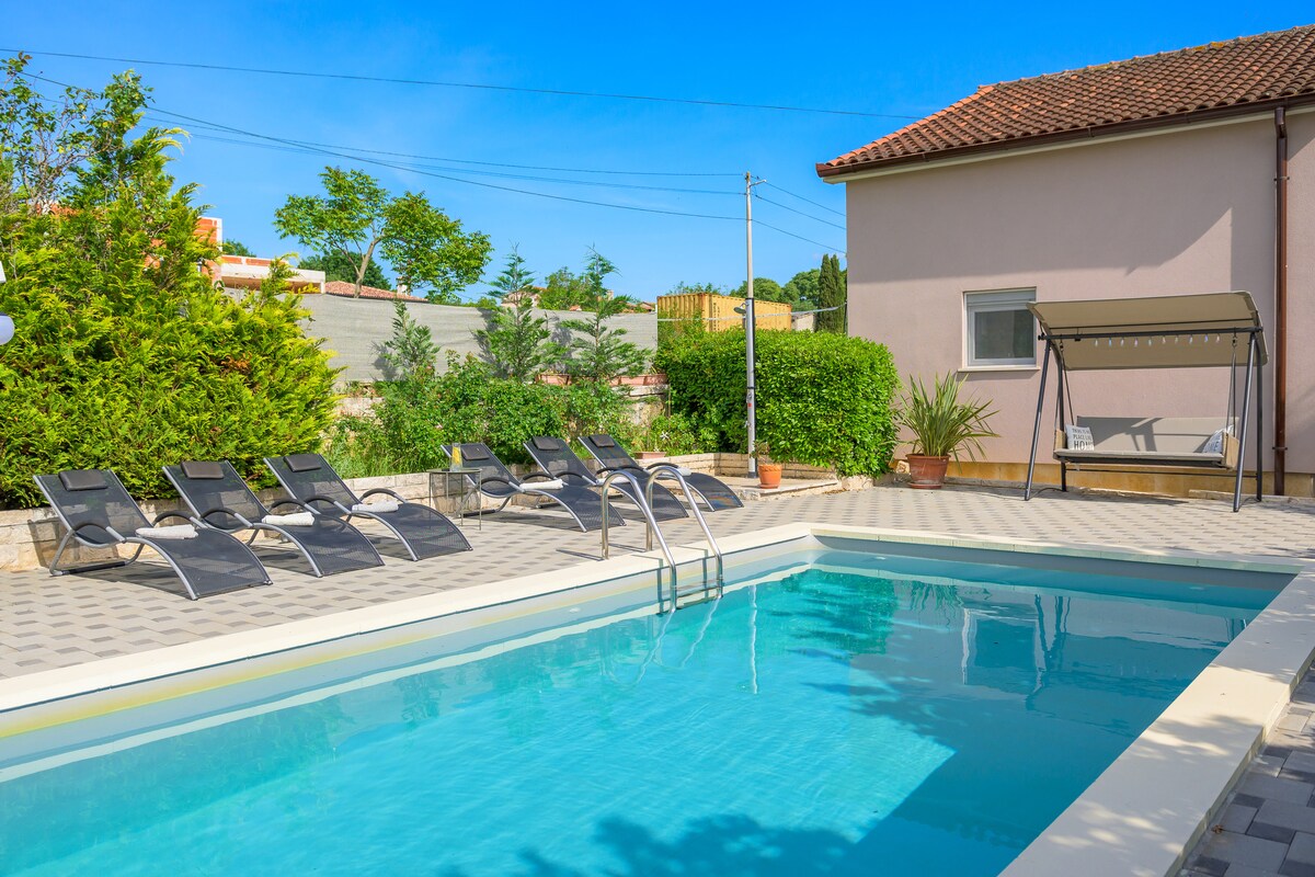 Holiday house Benina Rossa is located in central Istria in Zminj in the small village of Slivari. The house has a large yard, swimming pool, outdoor kitchen, play facilities such as table tennis, volleyball nets, etc. Inside the house is equipped with kitchen, living room, fireplace, wine cellar, 3 bedrooms and 3 toilets.