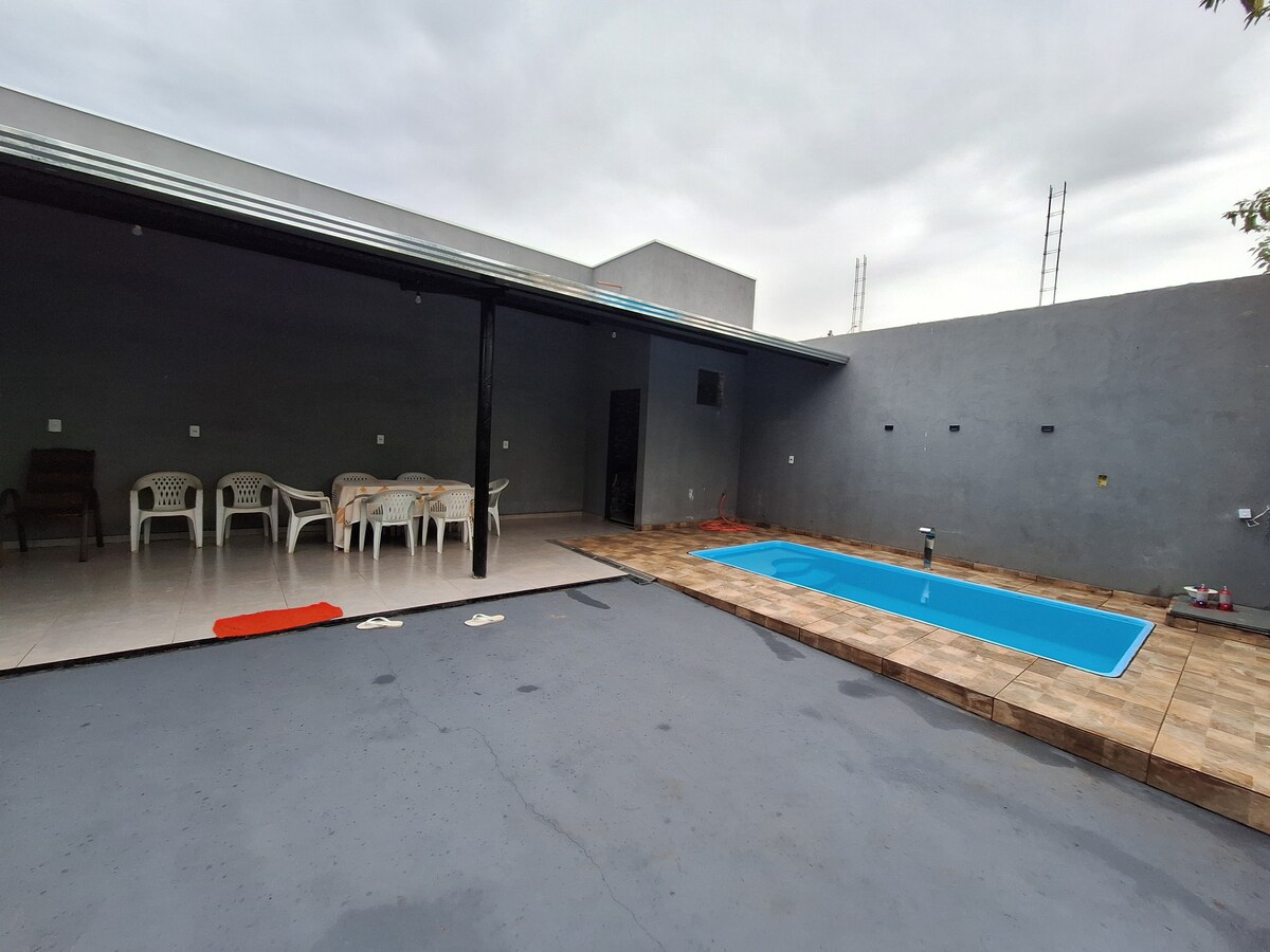 Nosso rancho fica em condomínio fechado com segurança 24 horas. temos 5 quartos para 16 pessoas confortavelmente, todos os quartos tem ar condicionado. Temos uma sala de tv, e cozinha com ar condicionado, área gourmet com churrasqueira, cervejeira e ar condicionado. Piscina aquecida, mirante em cima dos quartos com visão ampla. Com tudo, fogão, geladeira, copos, utensílios de cozinha, temos uma quadra de vôlei, lareira externa e o condômino tem pear de pesca