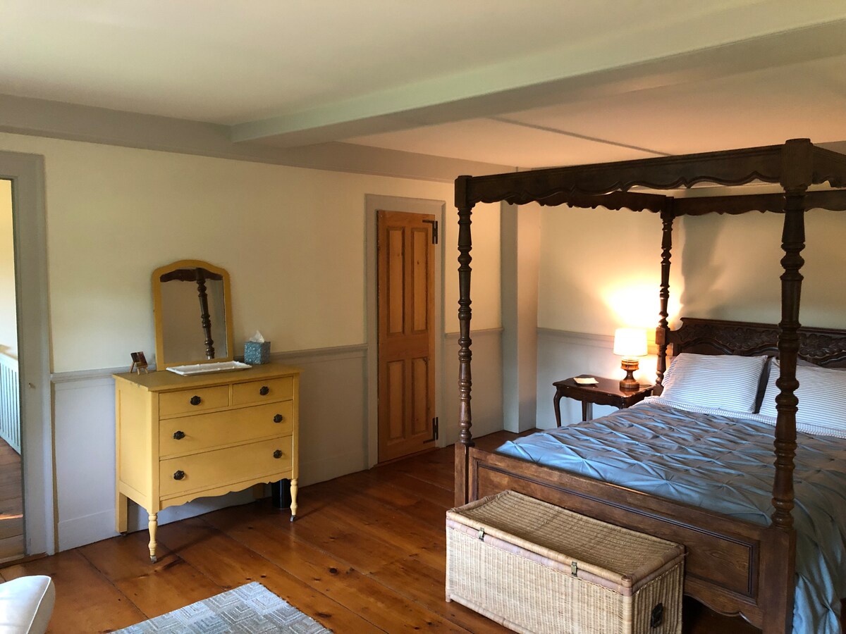 Rustic getaway in the beautiful Litchfield Hills of Northwestern Connecticut featuring a 2-acre pond and access to 9 miles of unique hiking trails on 450+ wooded acres. Cozy 1700's farmhouse comfortably sleeps 4 adults in 2 bedrooms, with an additional kids room that has a fold-out double futon and loft with one double air-mattress, perfect for children's sleeping bags. There is a pull out sofa in the living room. Dogs welcome! The house is next to Norbrook Farm Brewery, which you can walk to.