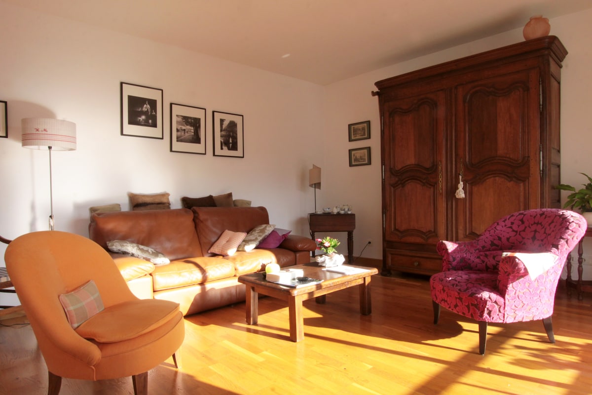 The Héron suite is a charming, very warm, bright accommodation, a real cocoon of happiness that can accommodate 4 people. Upstairs you will find a bedroom with a 4m high cathedral ceiling and a nice bathroom. On the ground floor you will find a small living room with a kitchenette and a bar, a bench unfolds into two single beds forming a 140 cm wide bed when the two mattresses are assembled. There is air conditioning for hot summers!