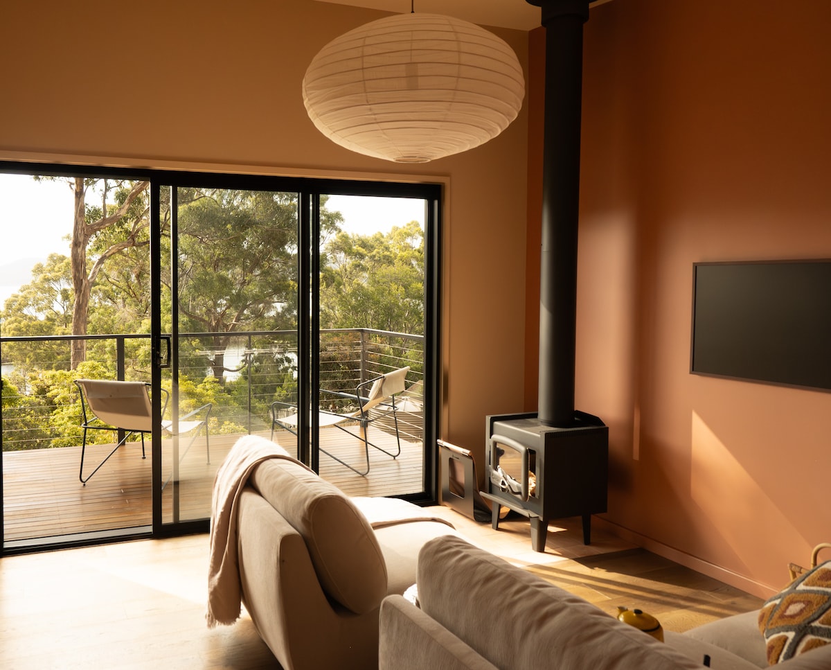 Huntingdon Tier Forest Retreat – atop a mountain in Tasmania's Southern Midlands. This luxurious, private & unimposing eco retreat is a place to escape, relax & reconnect. Soak in the woodfired hot tub & lounge by a warm fire or from your comfy bed, gaze through the treetops to the mountains beyond & observe local wildlife. Take a wander & enjoy a natural meditation cave just 30 metres below. Single night stays are welcomed, however guests often say they wish they had've stayed longer!