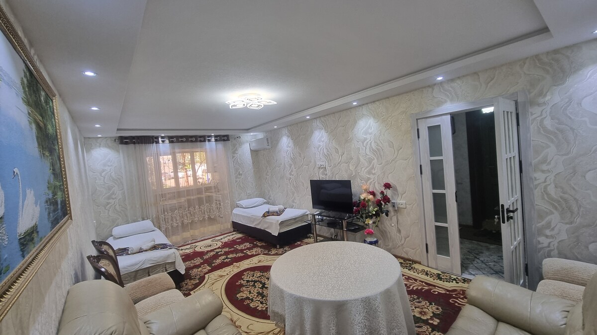 Wonderful place to stay. Condo fully furnished, peaceful place, green plants with wonderful view. Well located condo was renovated in February 2024 ( 115 m2) There are 3 large rooms: 1 bedroom, 1 cabinet (office) 1 large living room with sofa ( folding bed), and balcony with wonderful view The convenient location of the home allows you to easily get to the most popular sights of Samarkand. This will make your stay even more comfortable: you can simply walk along the Univer. Boulev. street.