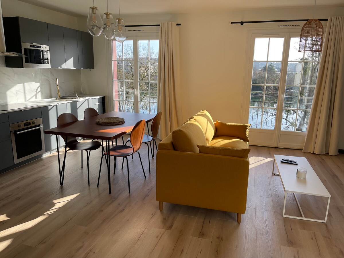 Welcome to our independent studio in the heart of our property. Ideally located, 200 m from the banks of the Seine, the studio has independent access with a private wooden terrace, you will be at home! On the ground floor, bathroom; living room and kitchen, the bay window, overlooks the terrace as well as the garden. The rest/night area is upstairs (attic bedroom) and includes two double beds (one 160 and the other 140): ideal for 3 adults or 2 adults and 2 children.