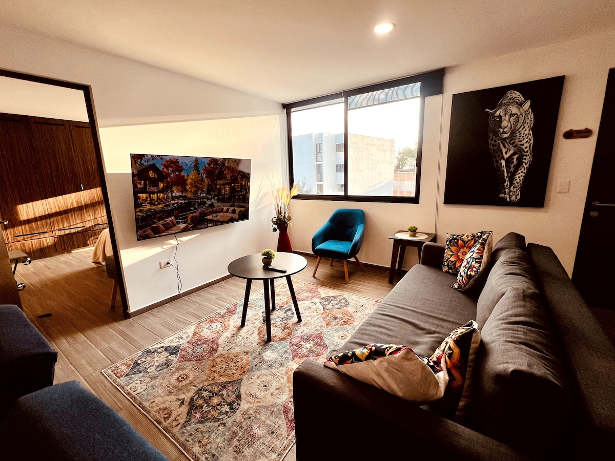 Wake up to breathtaking volcano views from the 18th floor — every sunrise, a new horizon. This modern & spacious loft blends comfort, design & perfect for families or long stays. Enjoy a fully equipped kitchen, blackout blinds & fast Wi-Fi for your home office. 24/7 gym, rooftop with 360° views, secure parking & pet-friendly building with private guard and 24/7 security. Perfect location close to cafés, restaurants & Puebla’s main attractions. Hosted by a Superhost with 4 years of top ratings