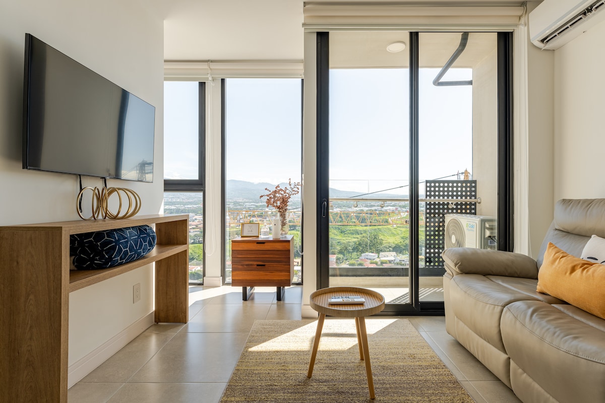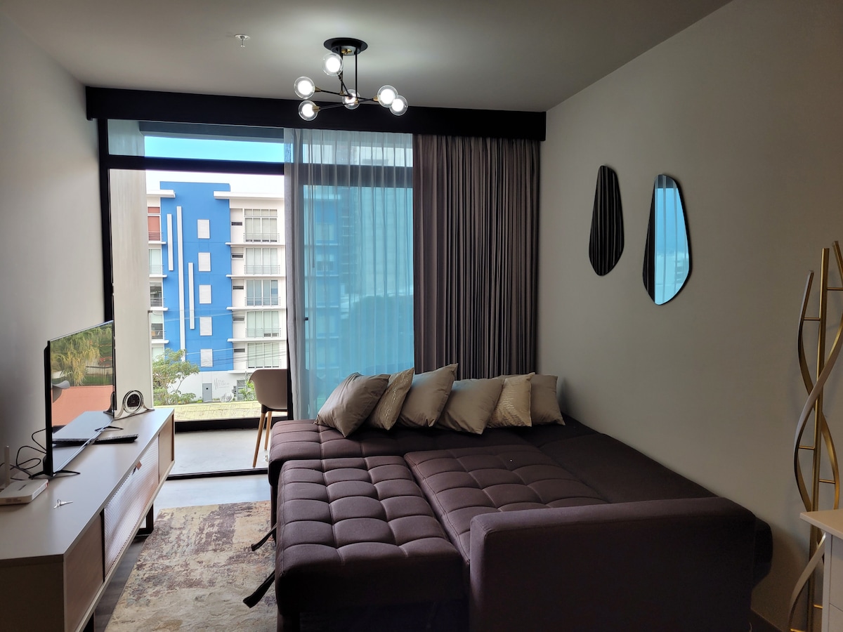 Luxury apartment with A/C, cozy, and perfectly located in the heart of the city. This fully equipped space, with modern and elegant decoration, offers you the freedom to live safely and comfortably while exploring everything the city has to offer. Close to tourist attractions, banks, supermarkets, and restaurants. (The condominium has 8 restaurants within the facilities) The International Airport (SJO) is 20 minutes away, La Sabana Park and the new National Stadium are 3 min away in San Jose.
