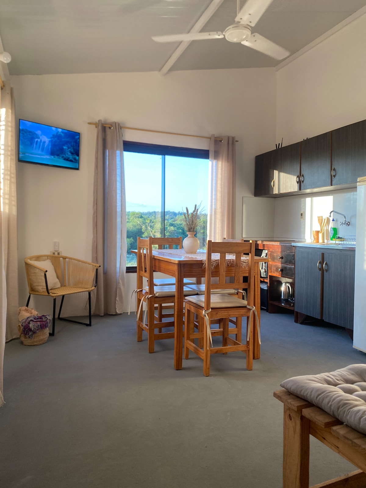 Acogedora suite rodeada de frondosos árboles, pileta y parrilla, ubicada en zona del Anfiteatro a pasos de supermercados, restaurants, bares y lugares turísticos para disfrutar de lo mejor de Sanber! Cuenta con todas las comodidades para descansar, cocinar, trabajar y pasar un buen rato. El lugar nace de la visión de conjugar una vivienda de estilo ecológico con un entorno muy natural, con árboles nativos de gran porte y varias especies de aves que frecuentan el lugar.
