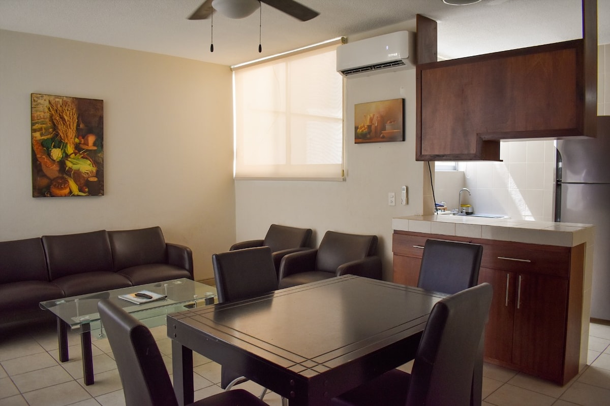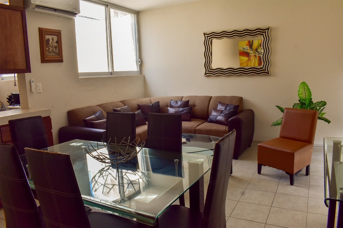 It's a lovely apartment. Located on the main avenue and half a block away from the central plaza. Walking distance from restaurants, bars and main attractions. Half a km from the beach. Es un departamento acogedor. Se encuentra sobre la avenida principal y a media cuadra de la plaza principal. A unos cuantos pasos de restaurantes, bares y atracciones. Y a medio Km de la playa.