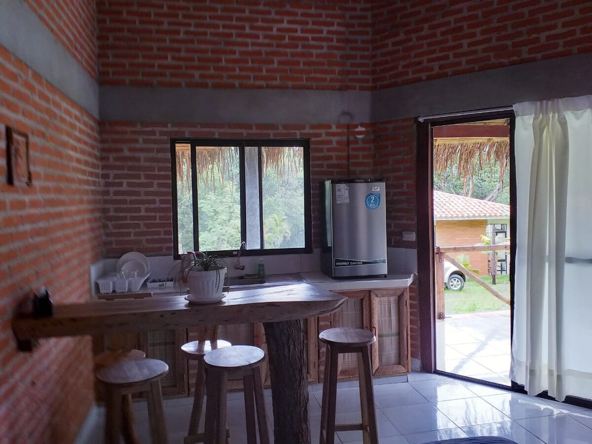 Disconnect from your concerns in this spacious and serene space. It has a barbecue grill and a large terrace to enjoy. Hammock stands with Paraguayan hammocks. A spacious cabin in an exclusive condominium, 7 minutes from downtown Buena Vista. Ideal for 10 people, but up to 2 more can be added. Clear your mind and connect with nature at the gates of the Amboro National Park.