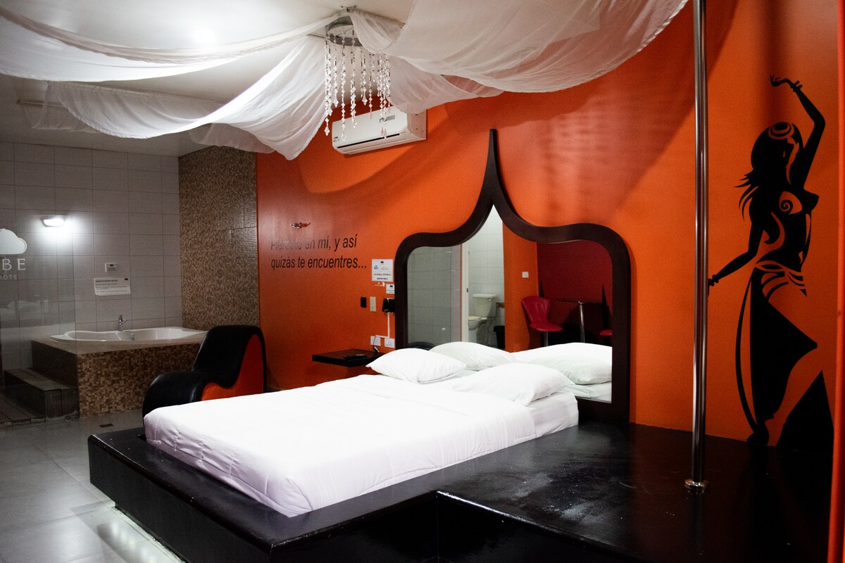 Enjoy the Grand Suite Mil y una Noche, designed for unforgettable moments. Perfect for couples, this suite features a Jacuzzi, erotic armchair, dance tube, air conditioning, WiFi and ambient sound. Located in a discreet location with secure parking, it offers you total privacy for a special night. Enjoy a romantic experience like no other. Book and make your night unforgettable! You'll love this adorable place to stay and escape the ordinary!