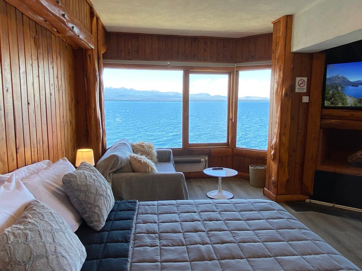 Disfruta de una estadía inolvidable en este cálido departamento monoambiente de 32 m2 ubicado sobre la costa del lago Nahuel Huapi, con las mejores vistas al lago y montañas. Acceso directo al lago. Deck con parrilla en el edificio. Estacionamiento. Ubicado frente a la parada de colectivo. Atención movilidad reducida: Es un tercer piso por escaleras. El hogar a leña es únicamente decorativo