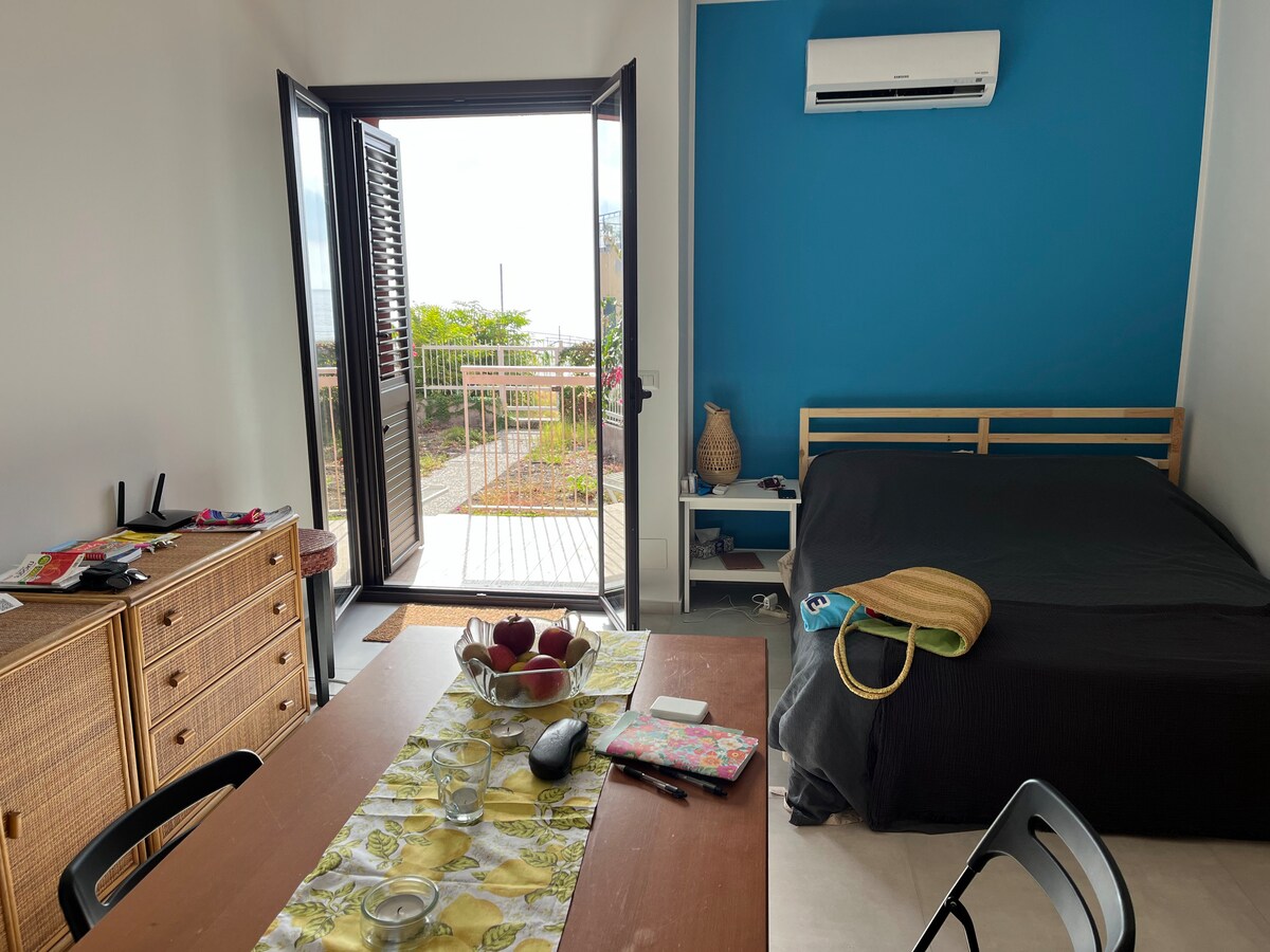 This lovely studio is a perfect place for couples or solo travellers looking for a peaceful beach holiday, while being well connected to some attractions like Taormina, Isola Bella and Gole dell'Alcantara. The beach is only meters away, and the flat features an ample front garden which is great for some lazy sunbathing, dinner and breakfast outside or for stars gazing. The flat was recently refurbished: it has A/C, wifi, washing machine and dish washer. No TV! Rather, enjoy Sicily :)