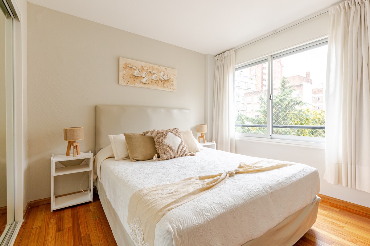 Super practical with good sunlight all day. Downtown (50 meters from the train station and 300 meters from the main avenue with more than 10 bus options). PRIVATE PARKING INCLUDED. 1 bedroom with double bed, full bathroom. Full amenities: Air conditioning in both rooms, TV with Chromecast, Wi-Fi, Washing machine, Microwave, Toaster, Coffee maker and Iron. Fully equipped kitchen elements and tableware.