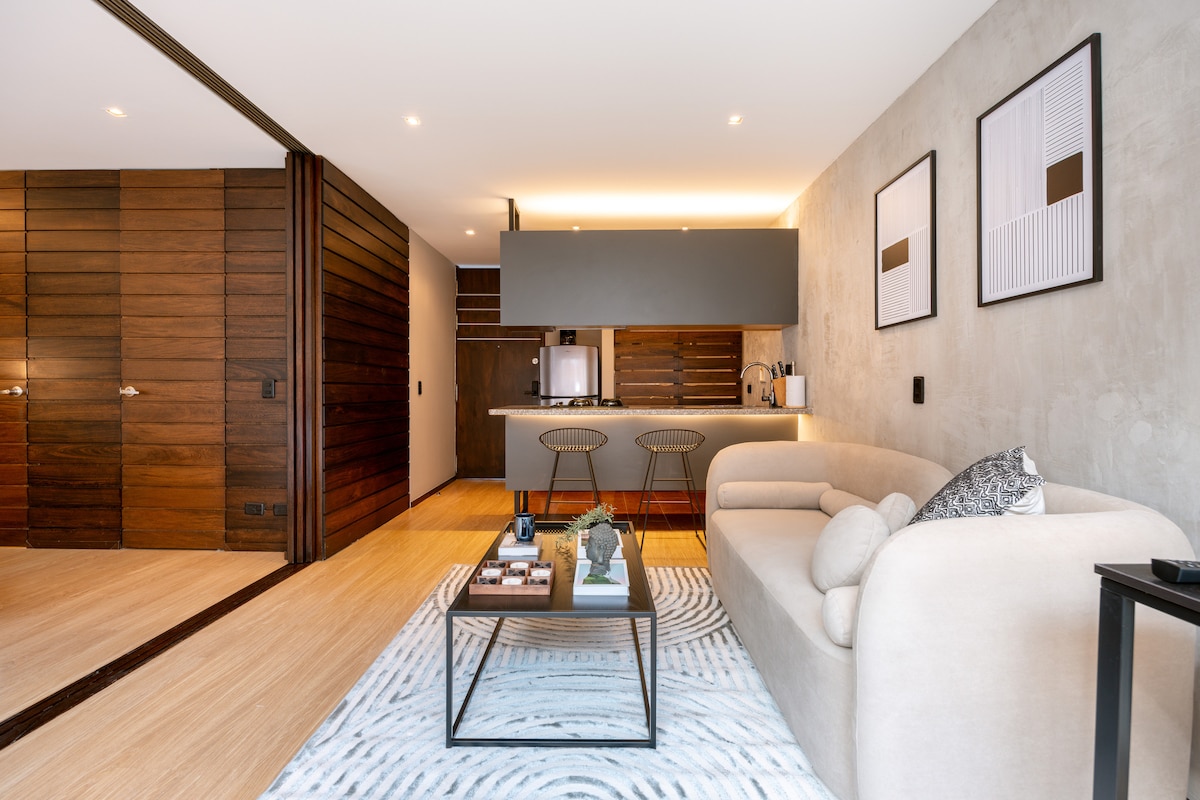 3450 Living is easy to spot among the trees in Laureles. Designed like the bow of a ship, the angular combination of glass, brick, black metal, and concrete is conveniently located. The relaxed atmosphere is perfect for young professionals, students, couples, digital nomads, or friends looking for a cost-effective space in a prime location. Four floors of modern-chic apartments feature expansive valley views from the balconies, residents also have access to the rooftop social area with jacuzzi.