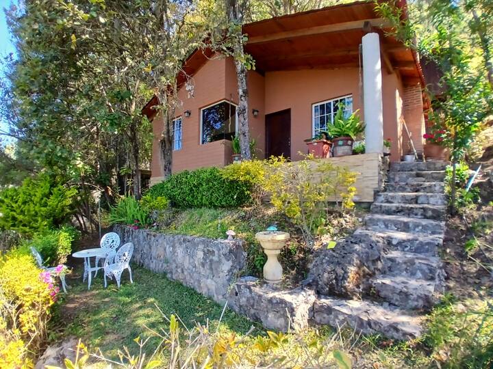 Cozy cabin with fireplace and terrace, your perfect retreat between mountains and trees. With Starlink Internet, stay connected for your remote work without sacrificing rest and comfort. Here, nature and technology come together to offer you a unique and inspiring experience. Enjoy panoramic views from anywhere in the cabin, plus it has a king-size bed and a large kitchen so you can prepare your food and enjoy it from the terrace.